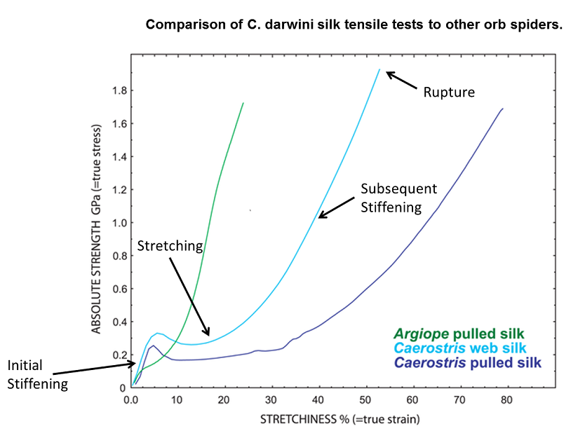 How do these seemingly bizarre non-linear properties help a spider web survive? The effect of the initial stiffening is easy to see, as the web stiffens up to resist an insect or other weight that lands on the web. The second phase – stretching under load – helps the web survive sustained loads, applied over the entire surface; in this way spider webs typically survive winds of hurricane intensity, suffering minimal damage. The third phase of the non-linear behavior – the sudden stiffening as load increases – helps to focus the stress resulting from very high loads on a silk thread (such as the struggling of a large insect trying to break free) into a very local area. This effect, combined with the sudden rupture under this increased stress, ensures that breaks in the web are always extremely localized, where they can be repaired, or even ignored, by the spider. If the third and fourth phase of the material non-linear behavior did not work in tandem like this, increased local loads would always be transmitted back into the web as a whole, threatening to pull down the entire web and thus requiring a rebuild from scratch. (And then there is a fifth non-linear behavior – wet spider silk contracts up to 50% of its original size, tightening and strengthening to an equivalent degree! This allows webs to resist the increased weight when covered by rain drops.)