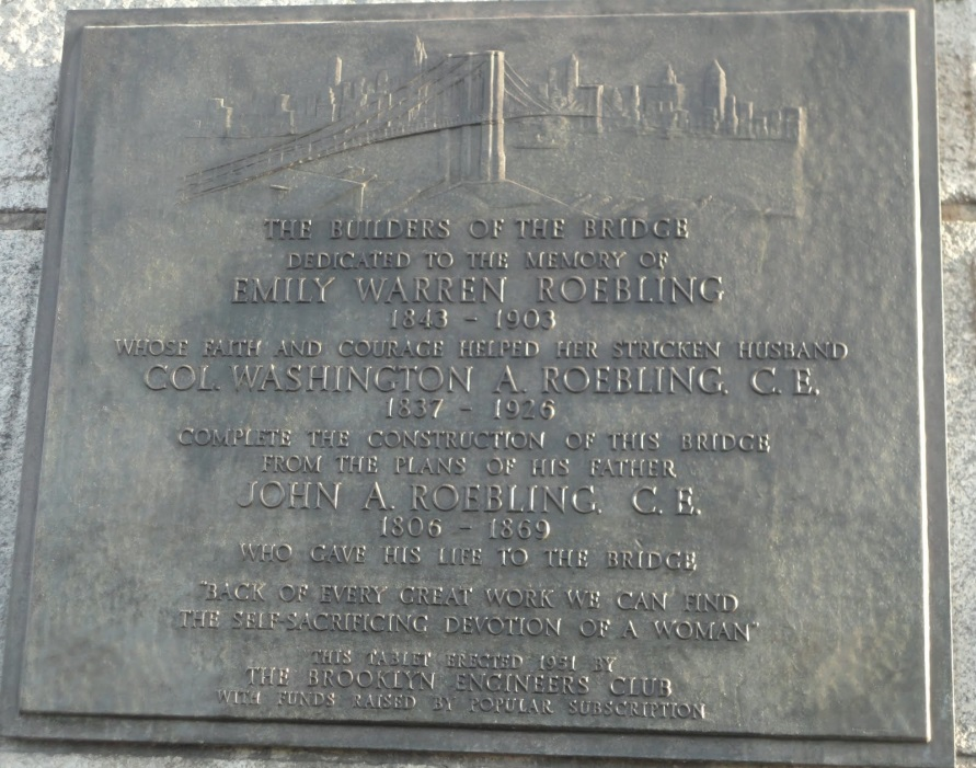 Emily Warren Roebling, Washington’s wife, was not formally trained as an engineer (as no women could be at that time), but one could not say that she wasn’t game.  After all, her honeymoon had consisted of a European tour spent investigating European caisson technology.  Once Washington fell ill, Emily became his sole connection to the project, serving as his liaison to the site, and, as acting Chief Engineer, supervised the daily construction at the bridge.  In order to carry out this work Washington taught Emily all he knew about structural engineering – mathematics, strength of materials, stress analysis, cable construction…and it was her doing that saw the project through.  In recognition of this fact, Emily Roebling was actually given top billing on the plaque erected in honor of the bridge’s builders.