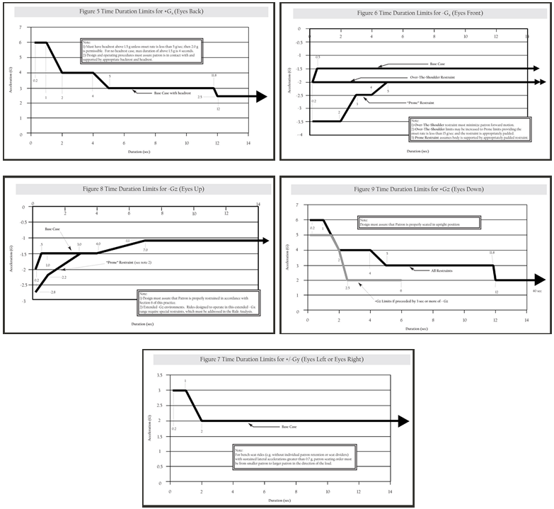 Roller coasters are known for their extreme accelerations, which equate to excitement on the part of the riders, but likewise equate to outsized loads on the structure. Of course there are limits to these accelerations. ASTM Standard F2291-14 “Standard Practice for Design of Amusement Rides and Devices” limits acceleration vs duration, relative to the human axes, in order to prevent brain injury to the riders: