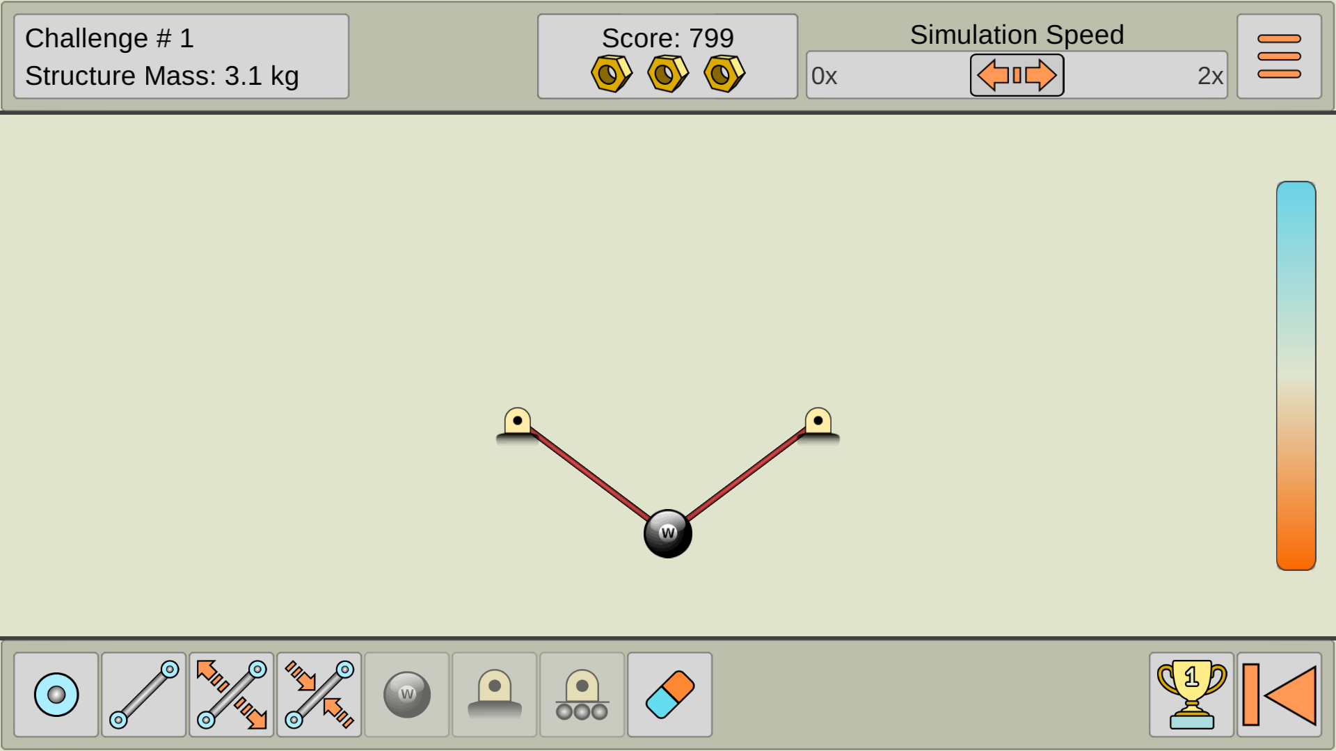 The cool thing is that this plays like a game (and, like many of the pinball machines I knew in college, lets me play over and over again for my original investment of $1.99).  Truss Me! has two “play” modes – Freestyle (where one can build whatever truss arrangement that fancy dictates) and Challenges mode, where the user is assigned specific tasks to complete (i.e. support pre-assigned loads against pre-assigned restraint configurations).  Like any good game, Challenges mode can be played competitively.  The more efficient the functioning design (as defined by minimizing total truss weight), the higher the score earned.  When playing solo, the goal is to score high enough to win achievement badges – up to three “Golden Nuts” – for scoring highly on each task.  When playing among friends, the goal is simpler: just beat everyone else.