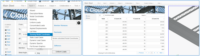 The Running Nodal Coordinates screen, which shows the Absolute X-Y-Z coordinates of every node (either as calculated or as explicitly entered via the Nodal Coordinates screen), is helpful for verifying that the structure’s geometry has been entered correctly. It can be accessed from the Input SubMenu of the Main Menu.