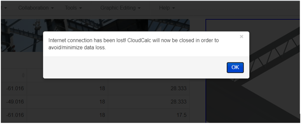 The Continuous Connectivity and LogIn Verification feature now constantly checks to ensure that 1) your CloudCalc session has not lost internet connectivity, and 2) you are still logged into CloudCalc Structural on this device (for example, if you log into CloudCalc Structural simultaneously on a different device, you will be logged out of the previous device). If either of these occur, your CloudCalc session will automatically be closed, and you will be prompted to log back into the program. This assures that there will be no lost work, due to the browser session being disconnected from the cloud.